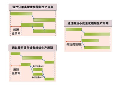 提供了各种缩短生产周期的方法:(1)通过订单小批量化缩短生产周期;(2)通过改变前后任务之间的连接方式,实现搬运小批量化,缩短生产周期;(3)通过工作分割,并将分割后的工作安排到并行设备上同时加工以缩短加工时间...